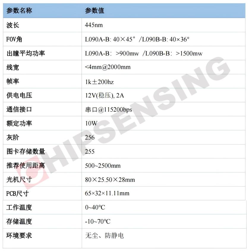 L090蓝光模组系列是基于单轴 MEMS 微镜的结构光扫描模组,微镜工作 在谐振状态下,具有较高的扫描稳定性。该模组使用 445nm 激光器、具有可编 程的条纹生成软件接口,用户可通过串口命令设置所需要的结构光。该模组可 作为 3D 深度相机结构光投影部件,组成单目、双目结构光相机。可配合相机 端实现远距离大物件的三维轮廓扫描、缺陷检测、引导定位、抓取等应用。